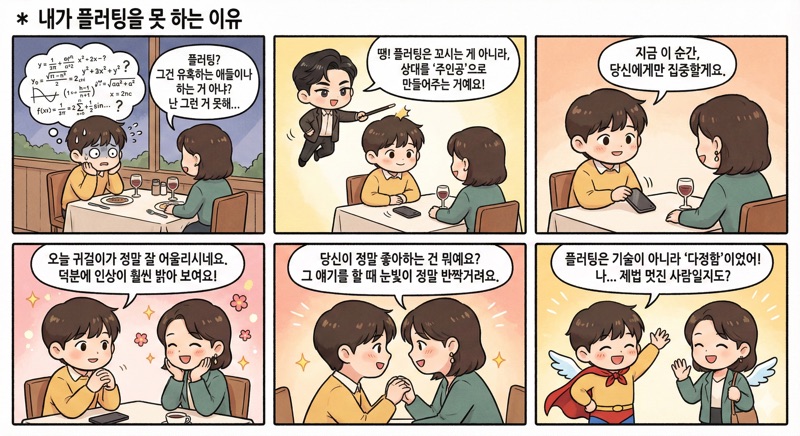 결국 플러팅은 기술의 문제가 아니라 '용기'의 문제입니다. 거절당할까 봐, 혹은 어색해질까 봐 벽을 쌓는 대신, 먼저 손을 내밀어 상대를 빛나게 해주겠다는 마음가짐. 그것이 우리를 고립에서 구해줄 진짜 슈퍼파워입니다. 이제 당신의 일상에서 이 마법을 연습해 보세요. 당신의 세계가 훨씬 더 다정해질 것입니다.