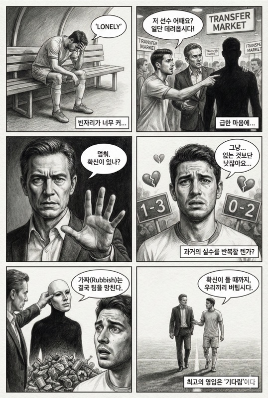 축구팀이든 인생이든, 가장 큰 비극은 '능력 부족'이 아니라 '잘못된 영입'에서 시작됩니다. 맨유의 새 사령탑 후벵 아모림이 1월 이적 시장을 앞두고 던진 메시지는, 섣불리 곁을 내주었다가 상처받는 우리들에게 묵직한 울림을 줍니다. 당신의 인간관계 스쿼드, 지금 안전한가요?