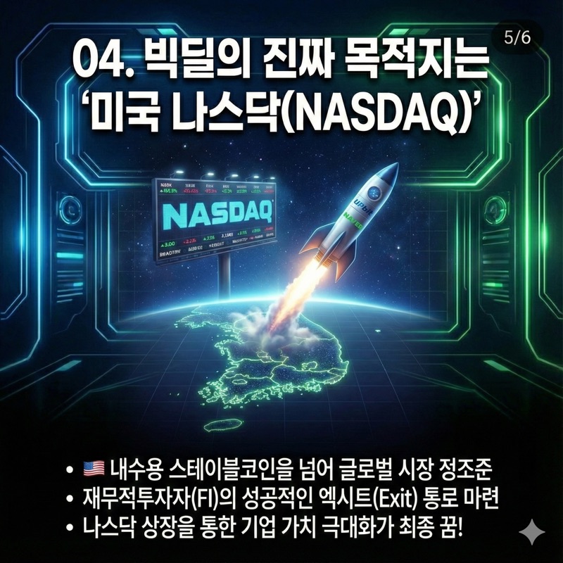 원화 스테이블코인으로 성공 모델을 만든 뒤, 이를 발판 삼아 글로벌 시장으로 진출하려는 큰 그림입니다. 특히 두나무의 경우 재무적투자자(FI)들의 성공적인 투자금 회수(엑시트)를 위해서라도 나스닥 상장이 절실한 상황이며, 이는 네이버파이낸셜 역시 마찬가지입니다.