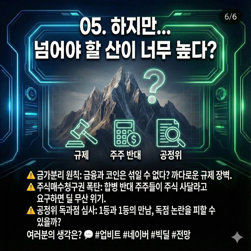 물론 장밋빛 미래만 있는 것은 아닙니다. 넘어야 할 현실적인 장벽들이 매우 높습니다. 가장 큰 걸림돌은 금융업과 가상자산업을 엄격히 분리하는 '금가분리' 원칙입니다. 또한, 합병에 반대하는 주주들이 대규모로 주식매수청구권을 행사할 경우 딜 자체가 무산될 리스크도 존재합니다. 마지막으로 각 분야 1위 기업의 결합인 만큼, 공정거래위원회의 독과점 심사라는 까다로운 관문도 통과해야 합니다.국내 금융과 가상자산 시장의 판도를 뒤흔들 이번 빅딜이 과연 숱한 규제 장벽을 넘어 성공적인 모델로 안착할 수 있을지, 업계의 이목이 쏠리고 있습니다.