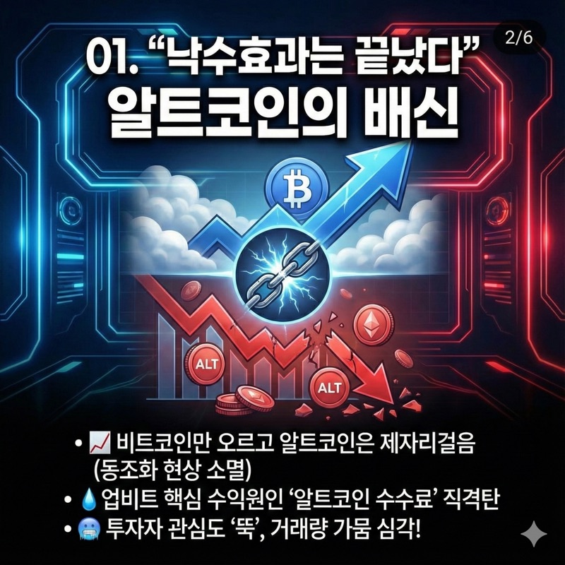 최근 가상자산 시장에 흥미로운 흐름이 포착되고 있습니다. 비트코인은 상승세를 타지만, 이른바 '낙수 효과'가 사라지며 알트코인 시장은 좀처럼 힘을 쓰지 못하는 '동조화 이탈' 현상이 심화되고 있죠. 알트코인 거래 수수료가 핵심 수익원인 국내 1위 거래소 업비트(두나무)에게는 달갑지 않은 상황입니다.