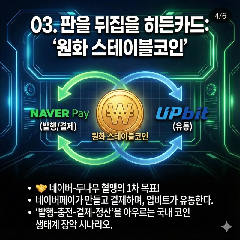 시나리오는 이렇습니다. 네이버페이가 스테이블코인의 발행과 결제·정산을 맡고, 국내 최대 유동성을 가진 업비트가 유통을 담당하는 구조입니다. '발행-충전-결제-정산'이 하나로 연결되는 강력한 코인 생태계가 탄생하는 셈입니다.